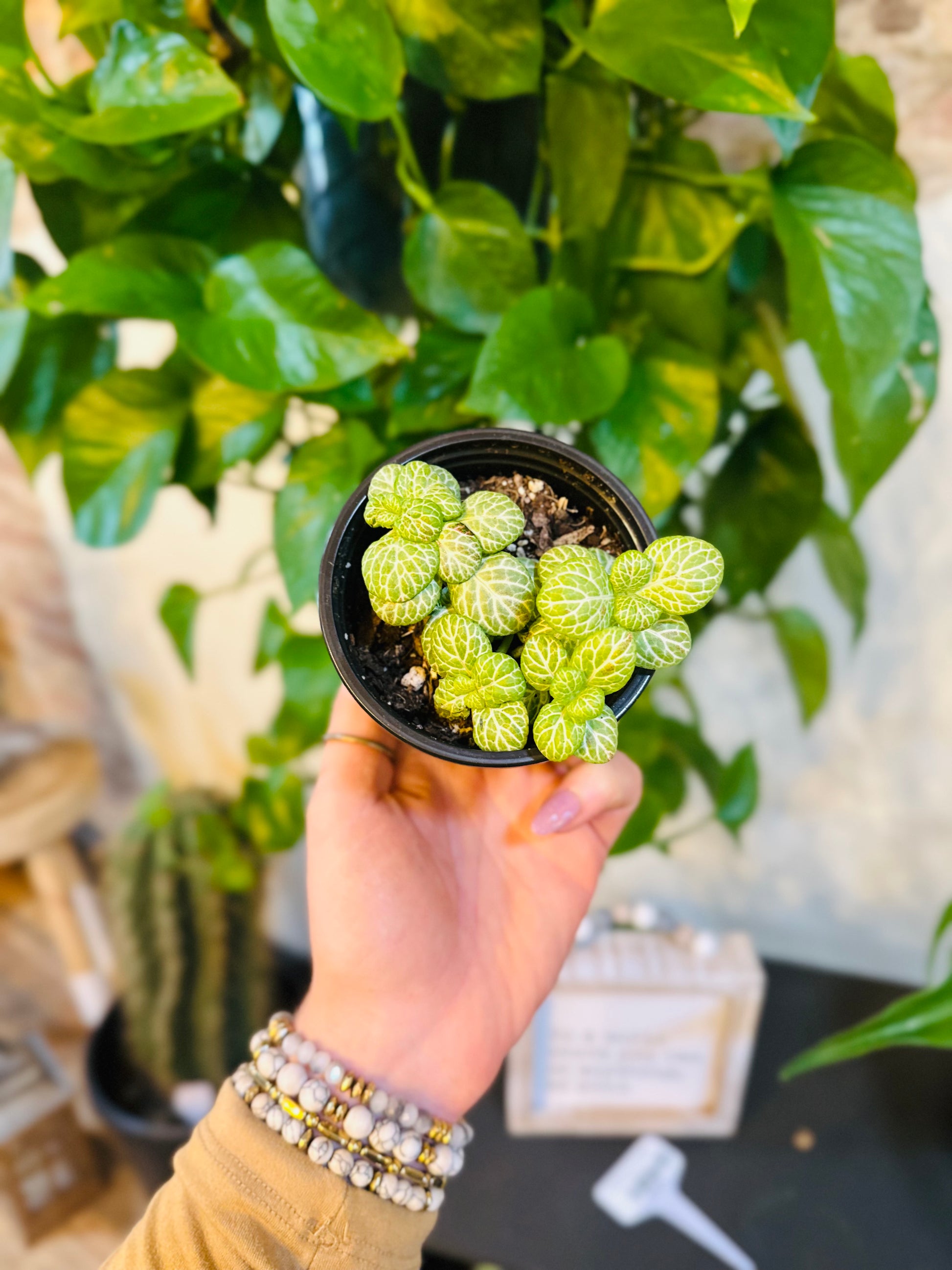 This eye-catching Fittonia variety lights up any space with its deep green leaves veined in fiery white-pink. Low-growing and full of texture, it’s perfect for terrariums, tabletops, or nestled into mixed arrangements. It loves humidity and makes a vibrant accent in any cozy corner.