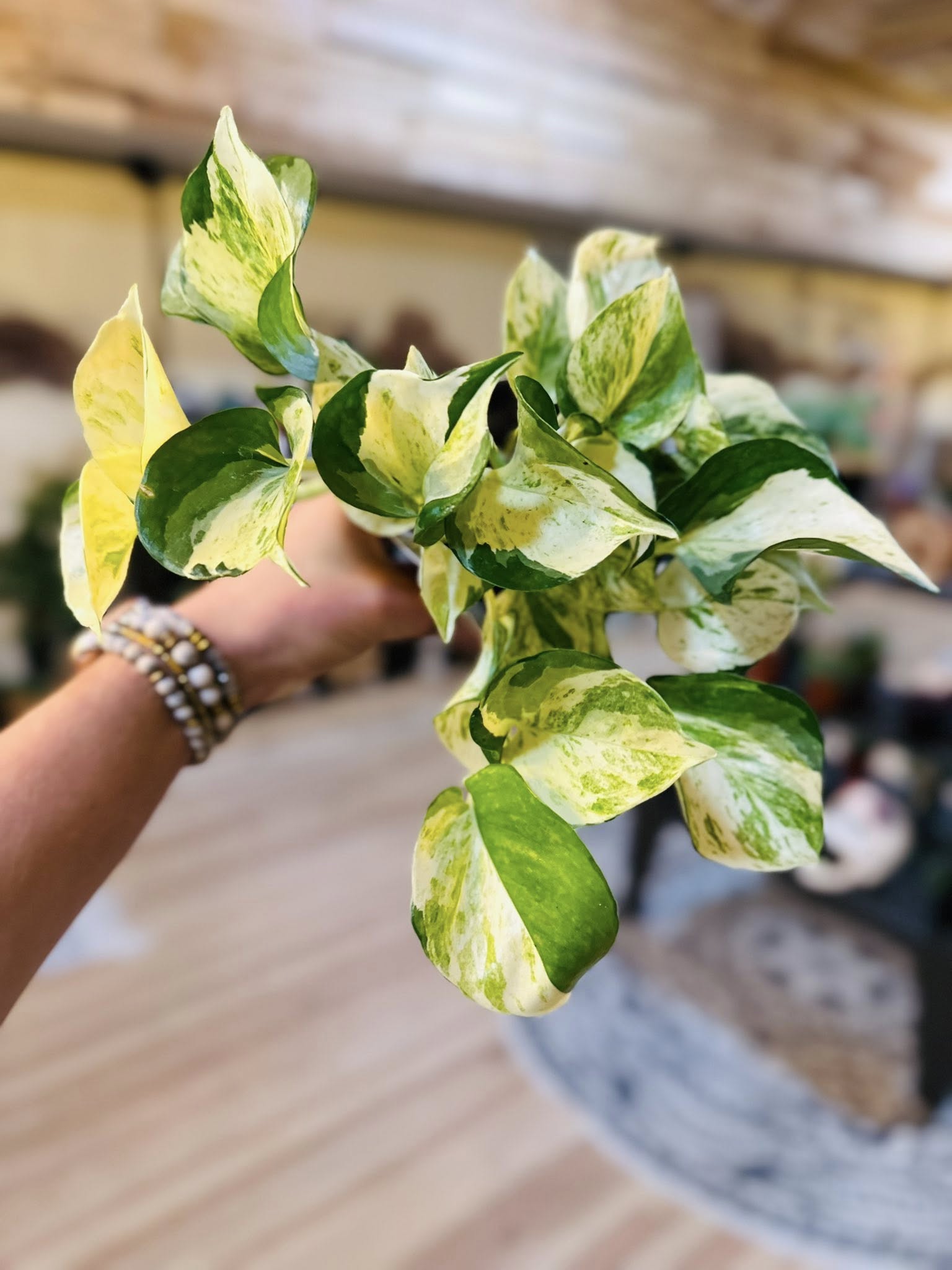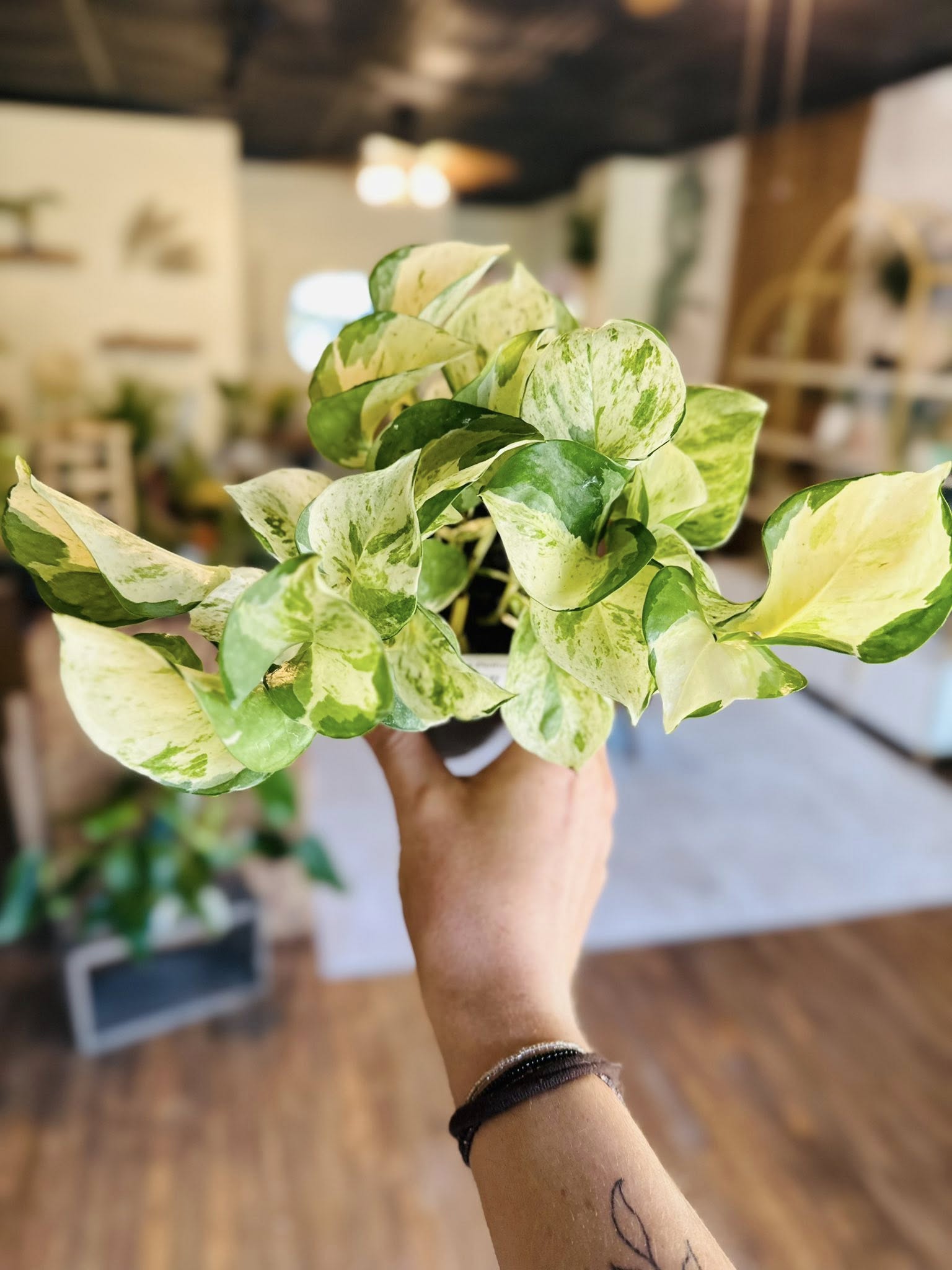This dreamy pothos sports large, heart-shaped leaves marbled with swirls of cream, green, silver, and white—no two are alike. ‘Manjula’ is a slower grower than other pothos, but what it lacks in speed it makes up for in sheer beauty. A standout on shelves or in hanging planters.
