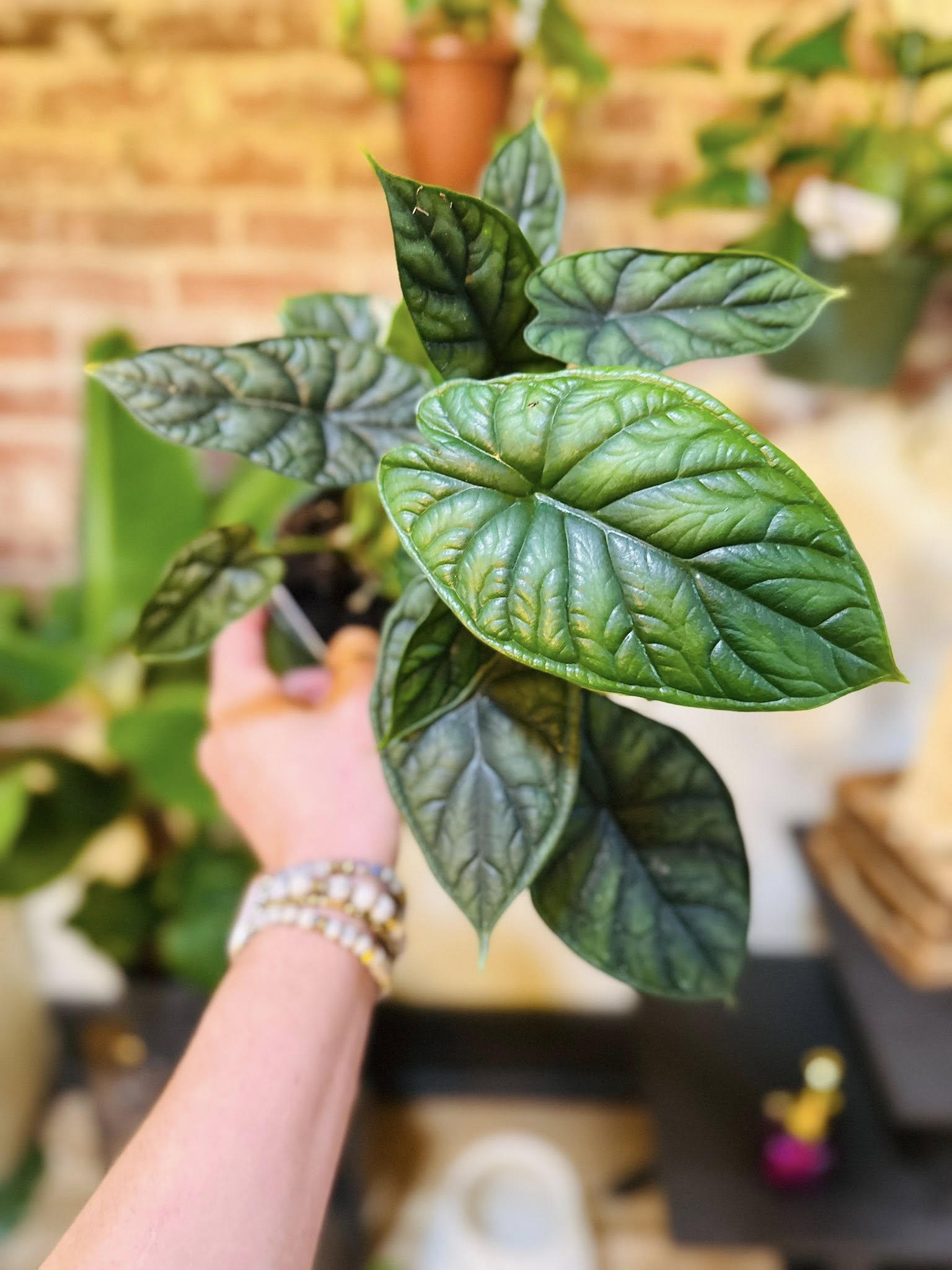 With deep green, leathery leaves that resemble dragon hide, this rare Alocasia is a true statement piece. The silver undertones and dark veining give it a striking, sculptural look that instantly elevates any collection. Bold, compact, and mysterious—it’s one for the fantasy lovers and foliage fanatics alike.