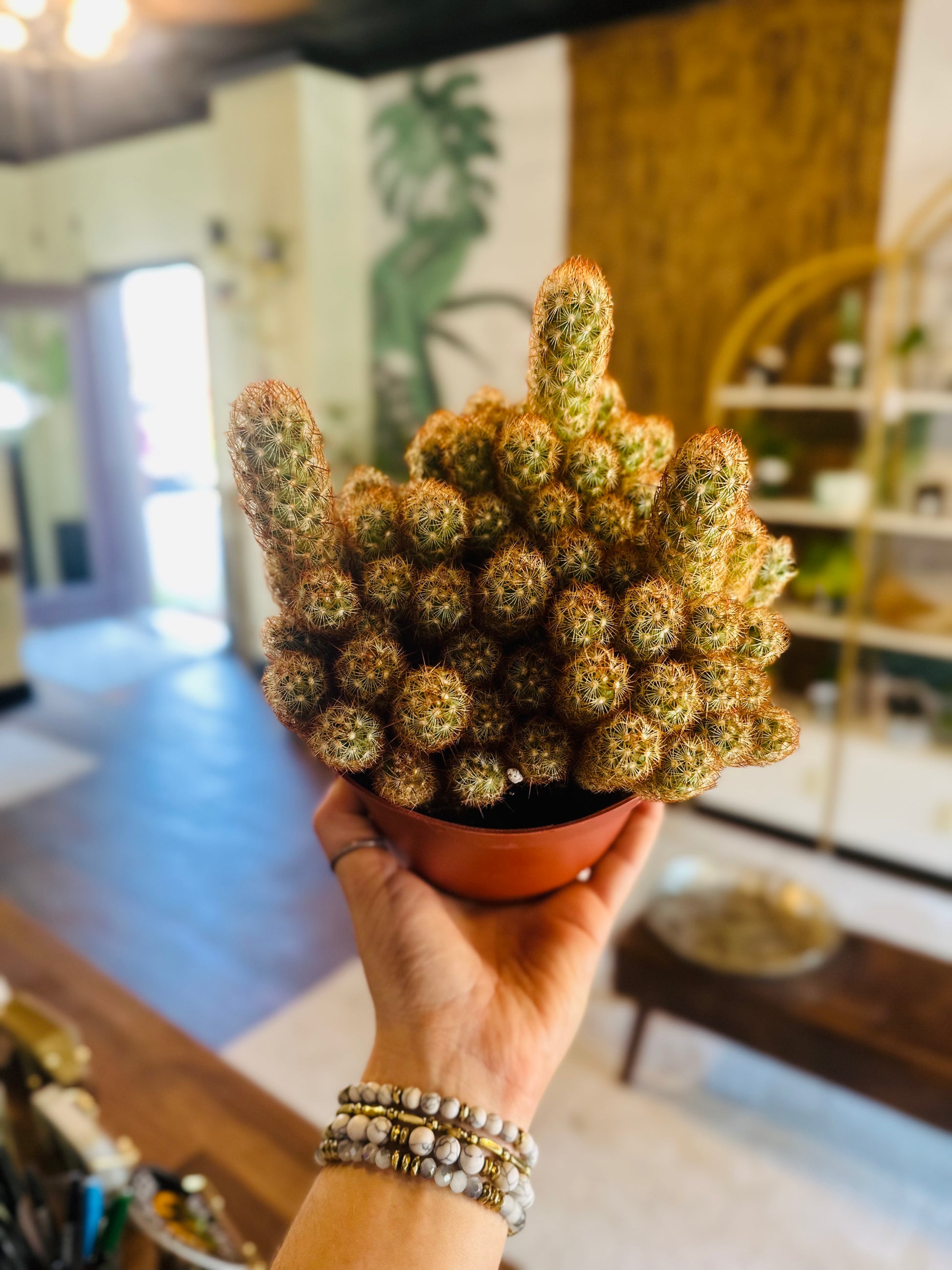 Fun Fact: The Gold Lace Cactus is a cultivar of Mammillaria elongata, commonly called the “Ladyfinger Cactus.” Its golden spines create such a dense covering that the green stems are often completely hidden, making the whole plant look like it’s glowing. 🌵✨