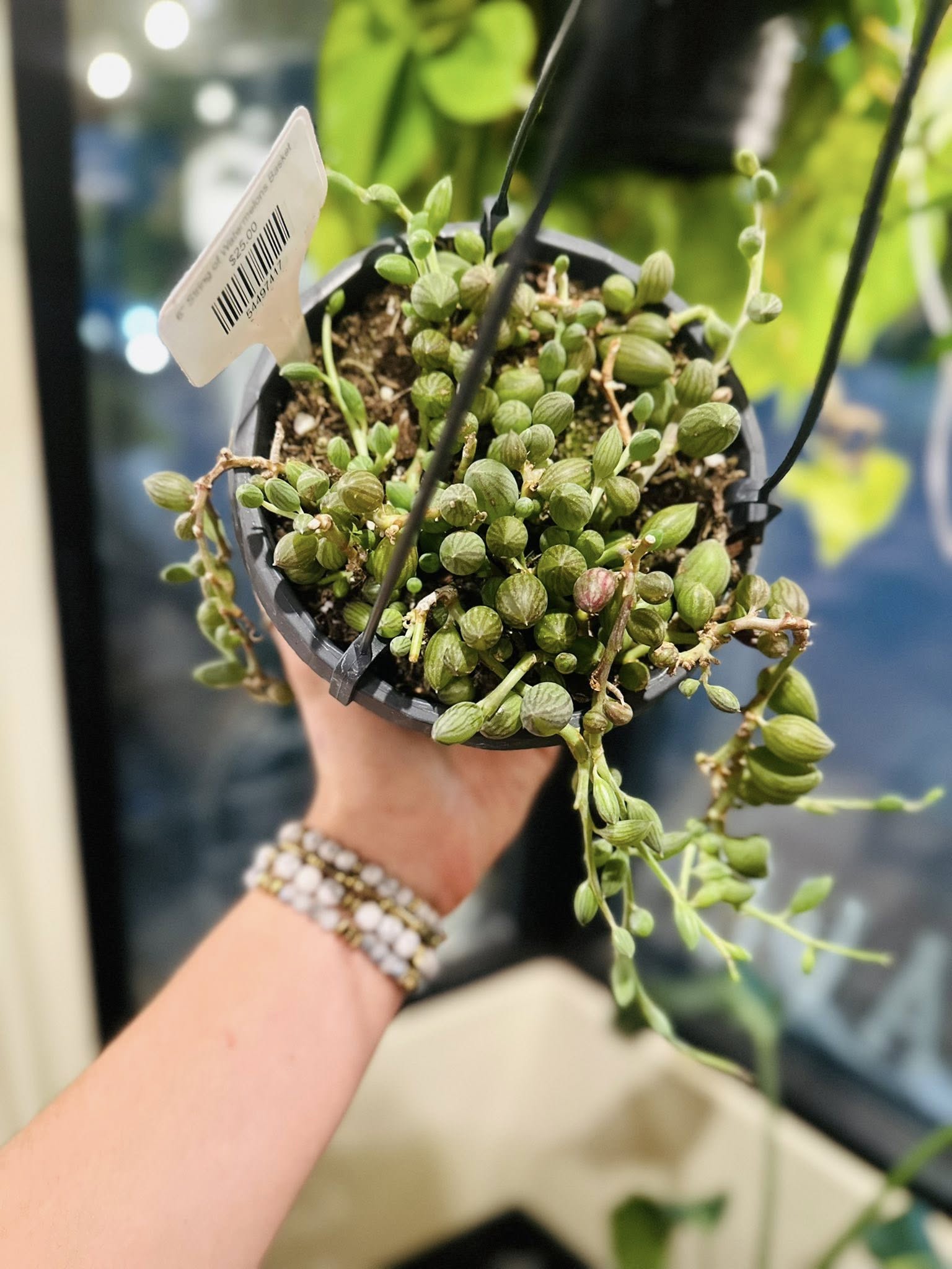 The String of Watermelons is a trailing succulent closely related to the String of Pearls, but its leaves are slightly larger and oval-shaped with beautiful striped markings that resemble miniature watermelons. It’s a charming hanging plant that adds a playful, cascading touch to shelves, window sills, or hanging baskets.