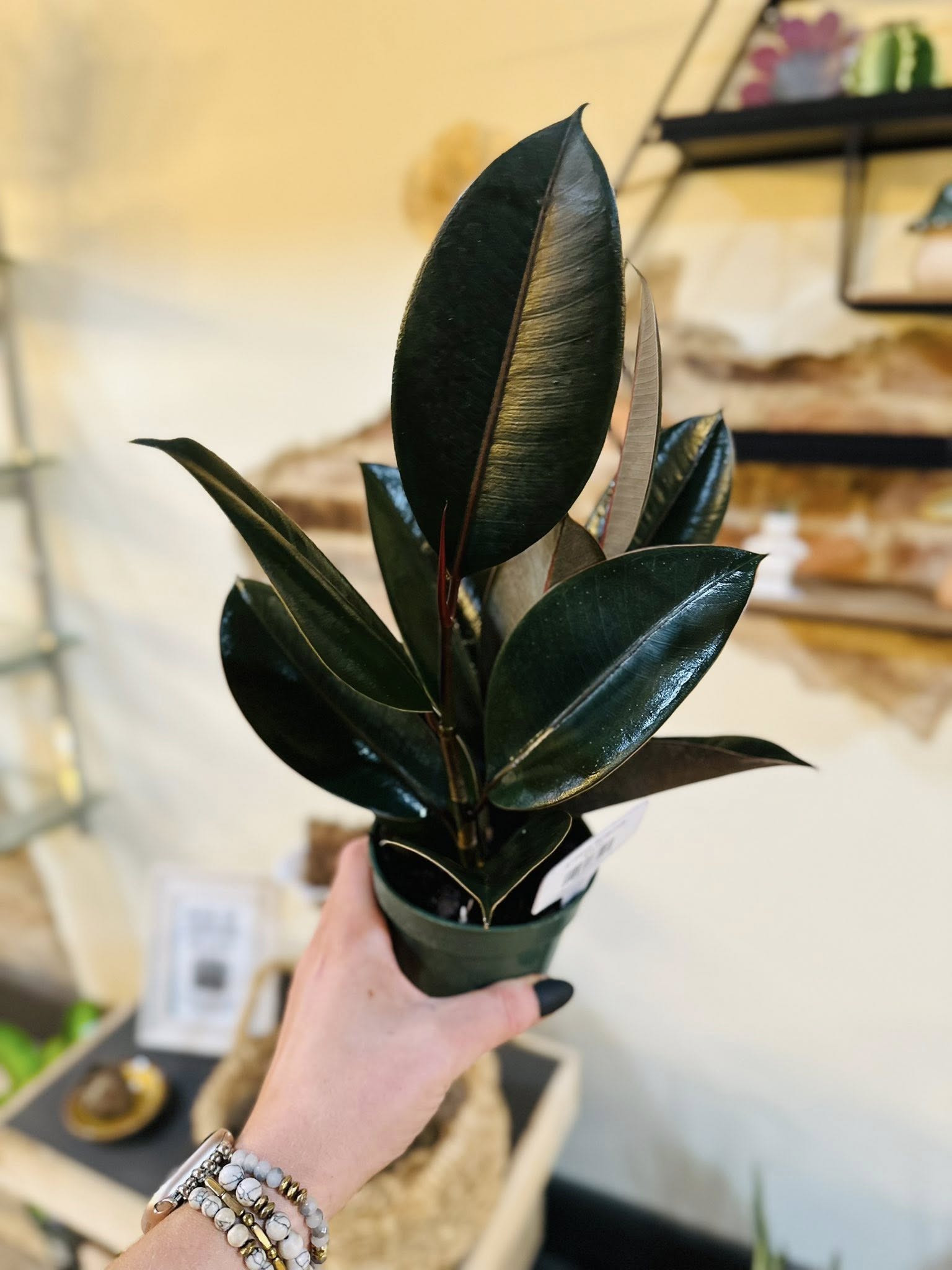A bold and elegant rubber plant variety with deep, almost black leaves that have a rich burgundy sheen. Its upright growth and glossy foliage make it a sophisticated statement plant for any home or office.