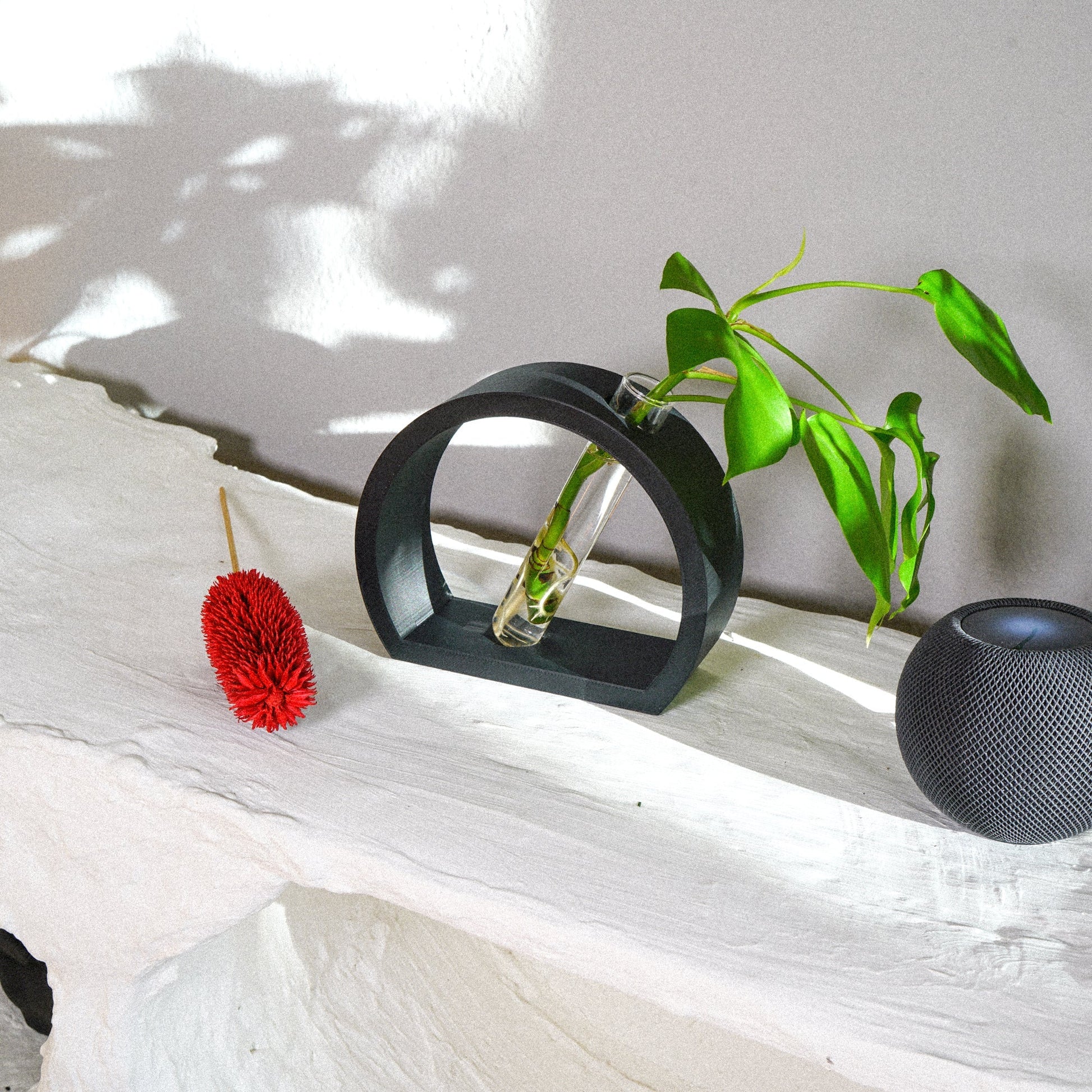 Nordic Semi-Circle Propagation Station that holds one 25x150mm glass tube for your favorite hydroponics plant cutting. This modern and minimalist stand will add a nice touch to any coffee table. Designed with slight slant but will not spill even when water is filled to the top, perfectly etched groove holds the tube in place. Tubes are large enough to hold most plants cuttings. These make for an excellent housewarming gift.