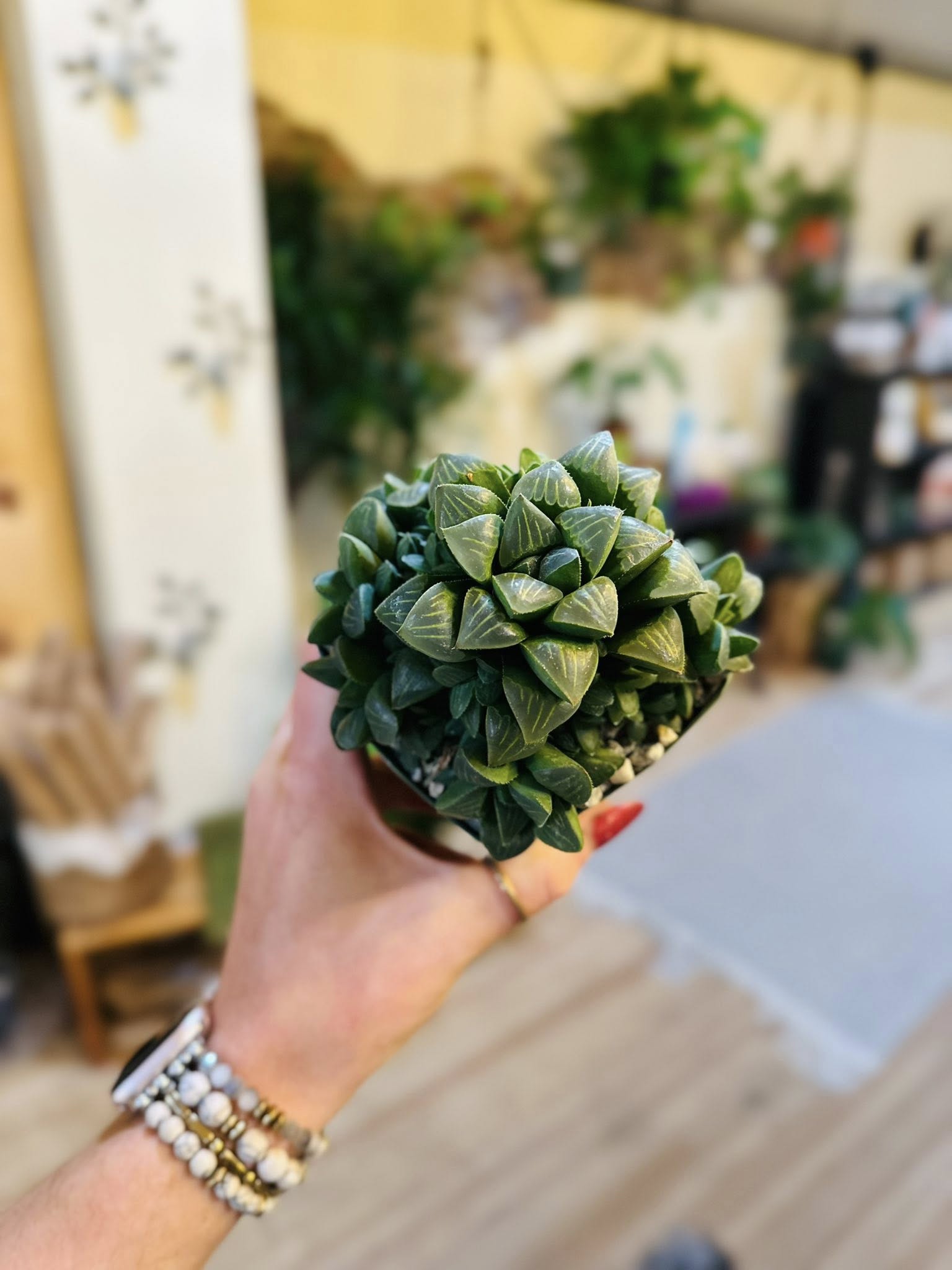 Haworthia retusa is a small, rosette-forming succulent admired for its triangular, translucent-tipped leaves that form a perfect geometric star. Its glossy, light-green leaves allow sunlight to pass through “windowed” tips—an adaptation from its South African habitat, where most of the plant stays buried in sand to avoid harsh sun. It’s compact, slow-growing, and nearly indestructible, making it a favorite for windowsills and small containers.