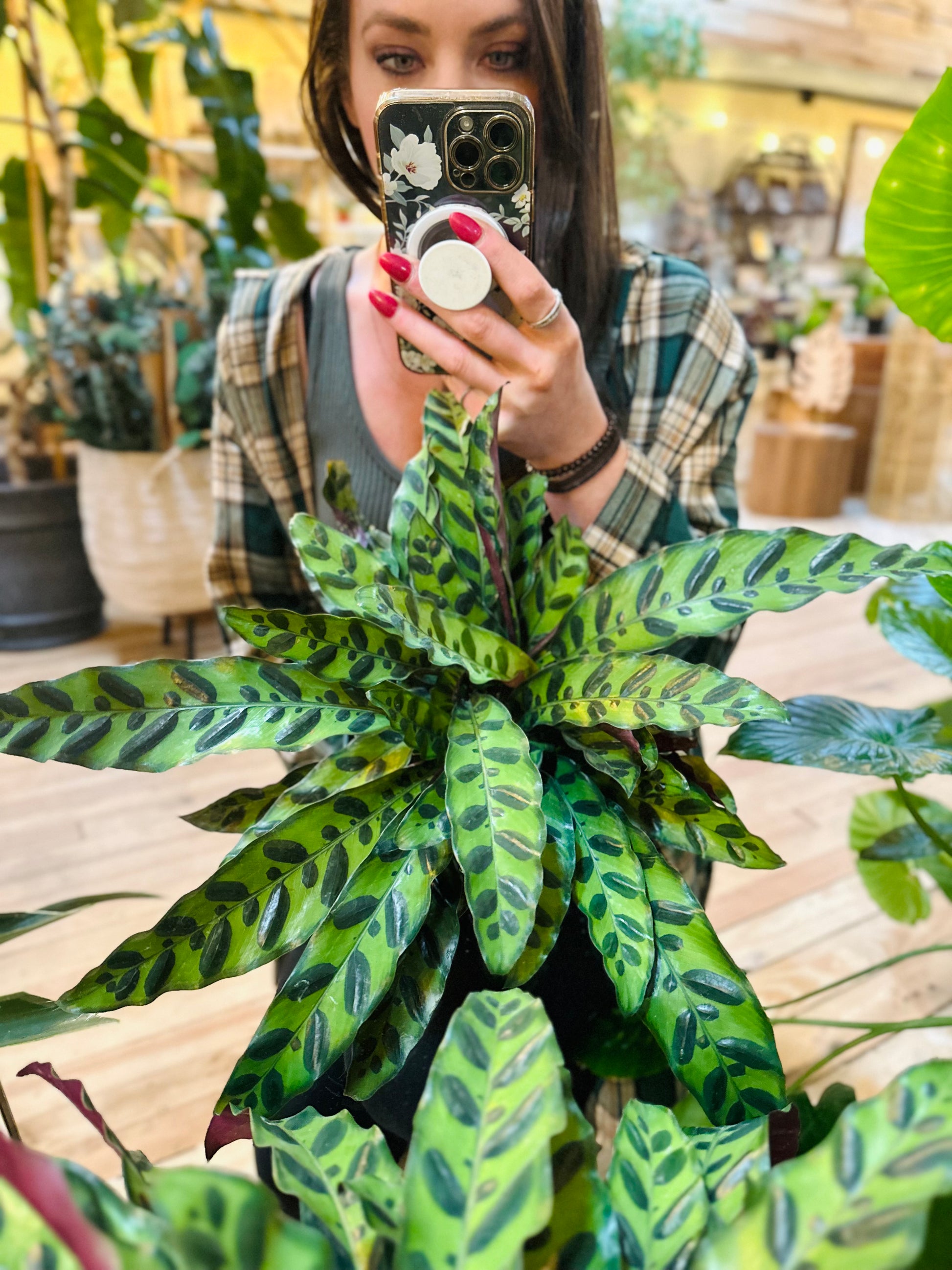 Calathea ‘Rattlesnake’ is a lively foliage plant loved for its long, narrow leaves patterned with bold dark green markings that resemble a rattlesnake’s skin. The undersides flash a deep purple, adding contrast and movement as the leaves gently sway and shift throughout the day. With its flowing shape and striking pattern, it brings energy and texture to indoor spaces.