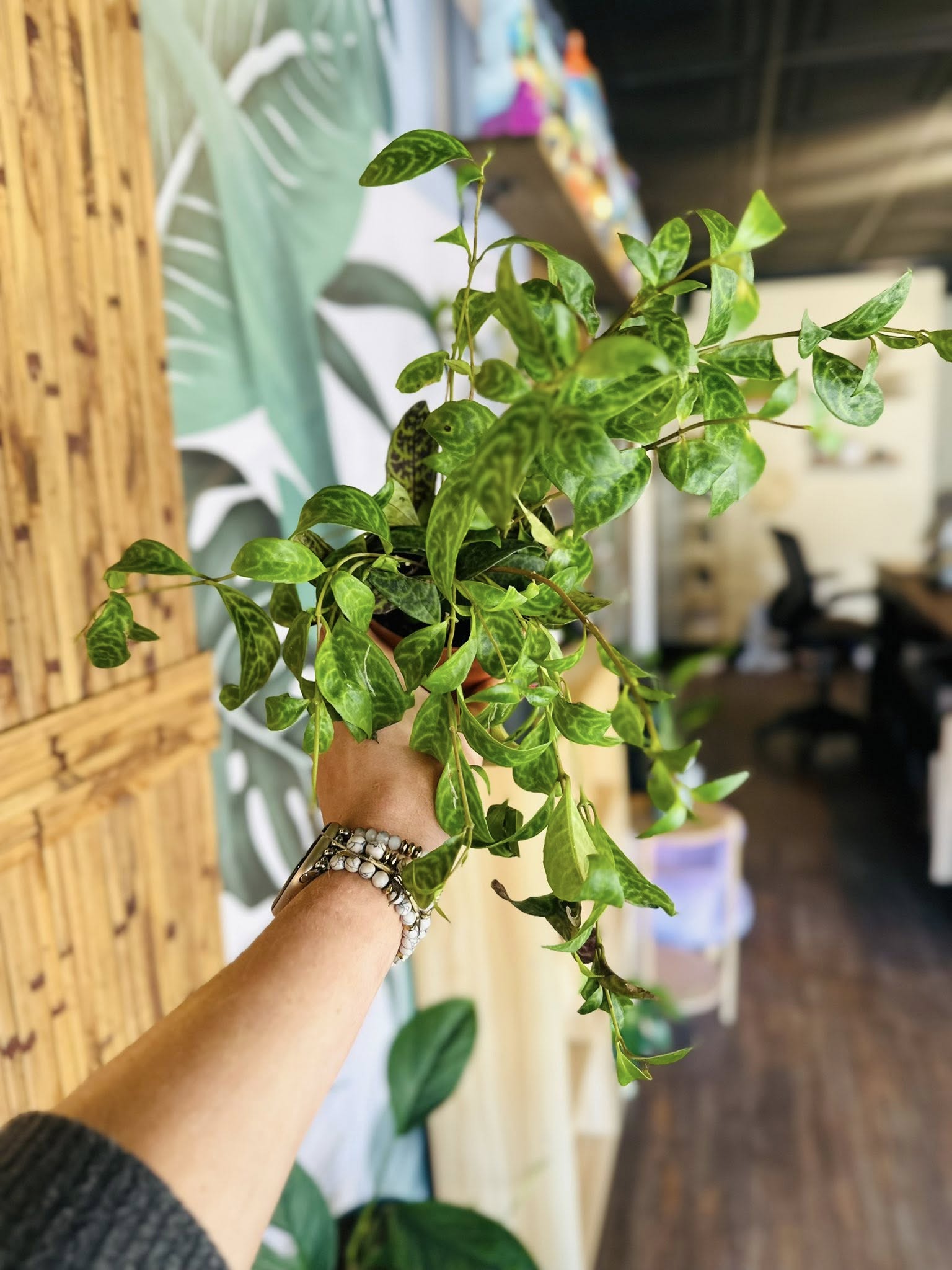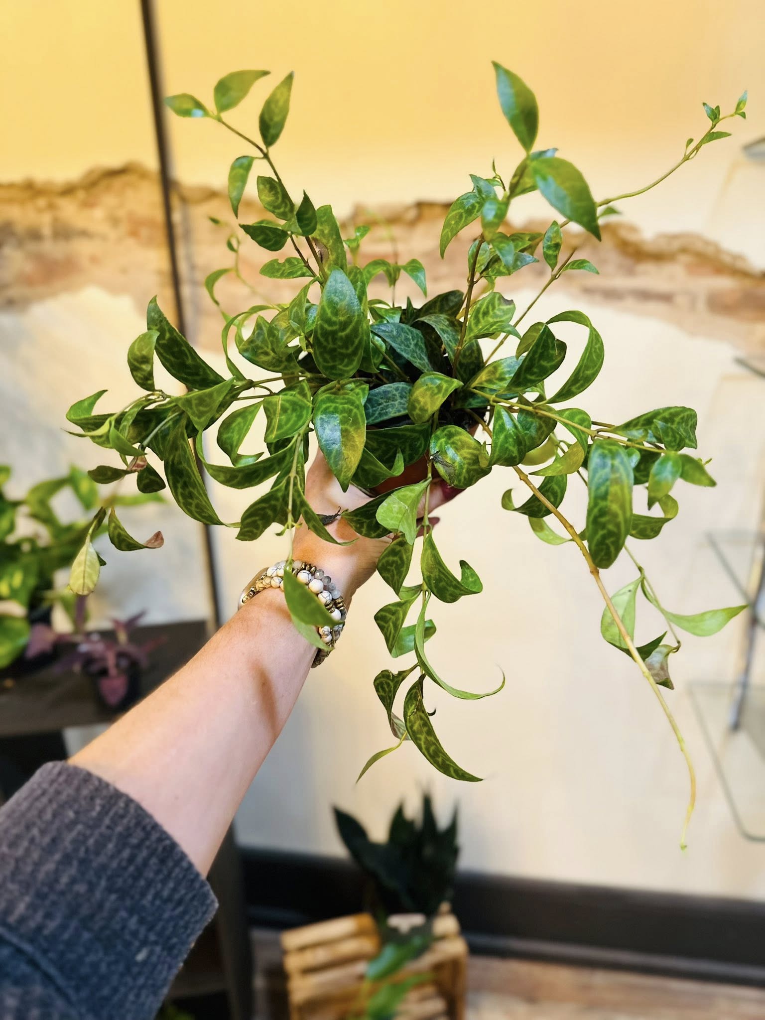 The Lipstick Plant ‘Black Pagoda’ is a stunning trailing houseplant known for its dark, patterned leaves and bright orange tubular blooms that peek out like little lipstick tubes. The foliage alone is a showstopper—deep green tops with bold, mottled veining and purple undersides—making it just as decorative when not in bloom. It’s perfect for hanging baskets or high shelves where its cascading vines can shine.