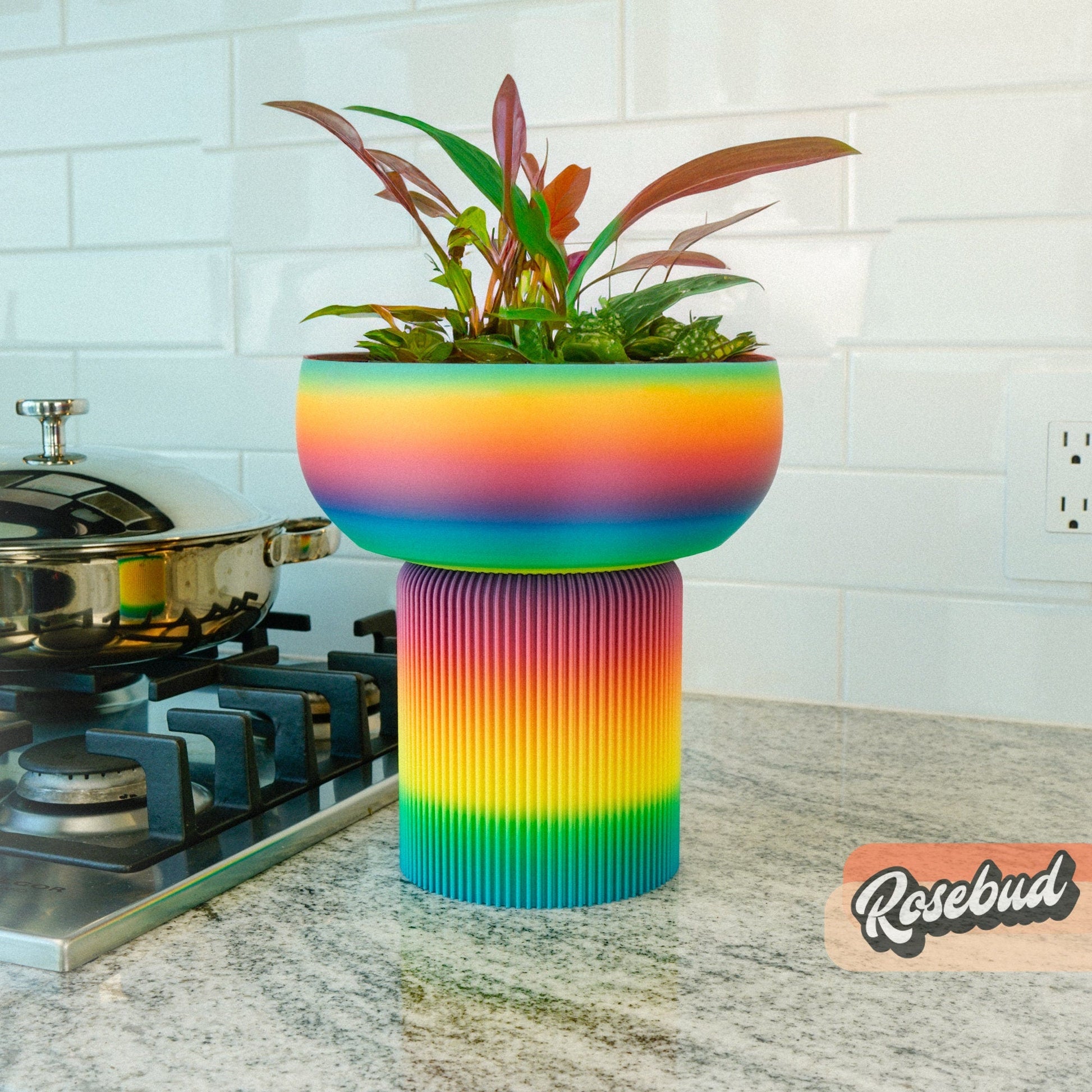 This planter is a beautifully crafted piece that combines both modern aesthetics and practical design. It features a bright bowl that rests atop a striking pedestal base, which is characterized by its vertical ribbing. This textural contrast not only enhances the visual appeal but also adds a touch of sophistication to any setting.