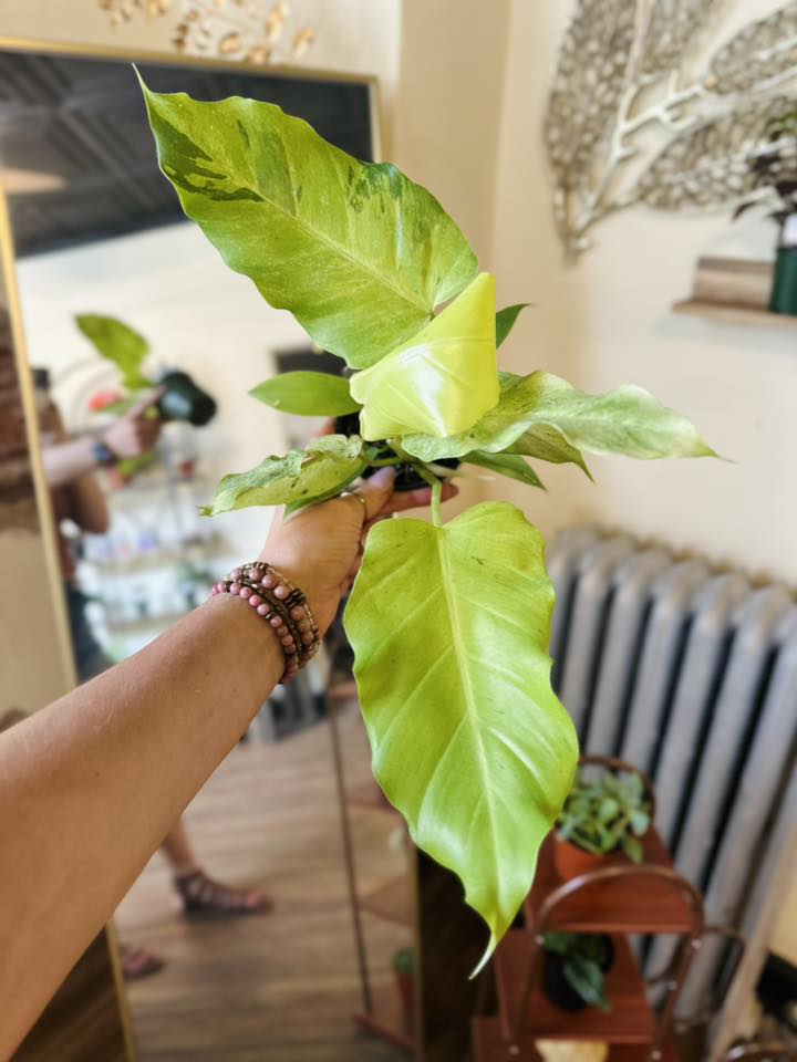 This dreamy philodendron features broad, speckled leaves that emerge creamy white and slowly shift to minty green as they mature—like a living snowstorm in plant form. Every leaf is unique, with marbled variegation that makes each plant feel one of a kind. A rare collector’s favorite that also thrives with basic care.