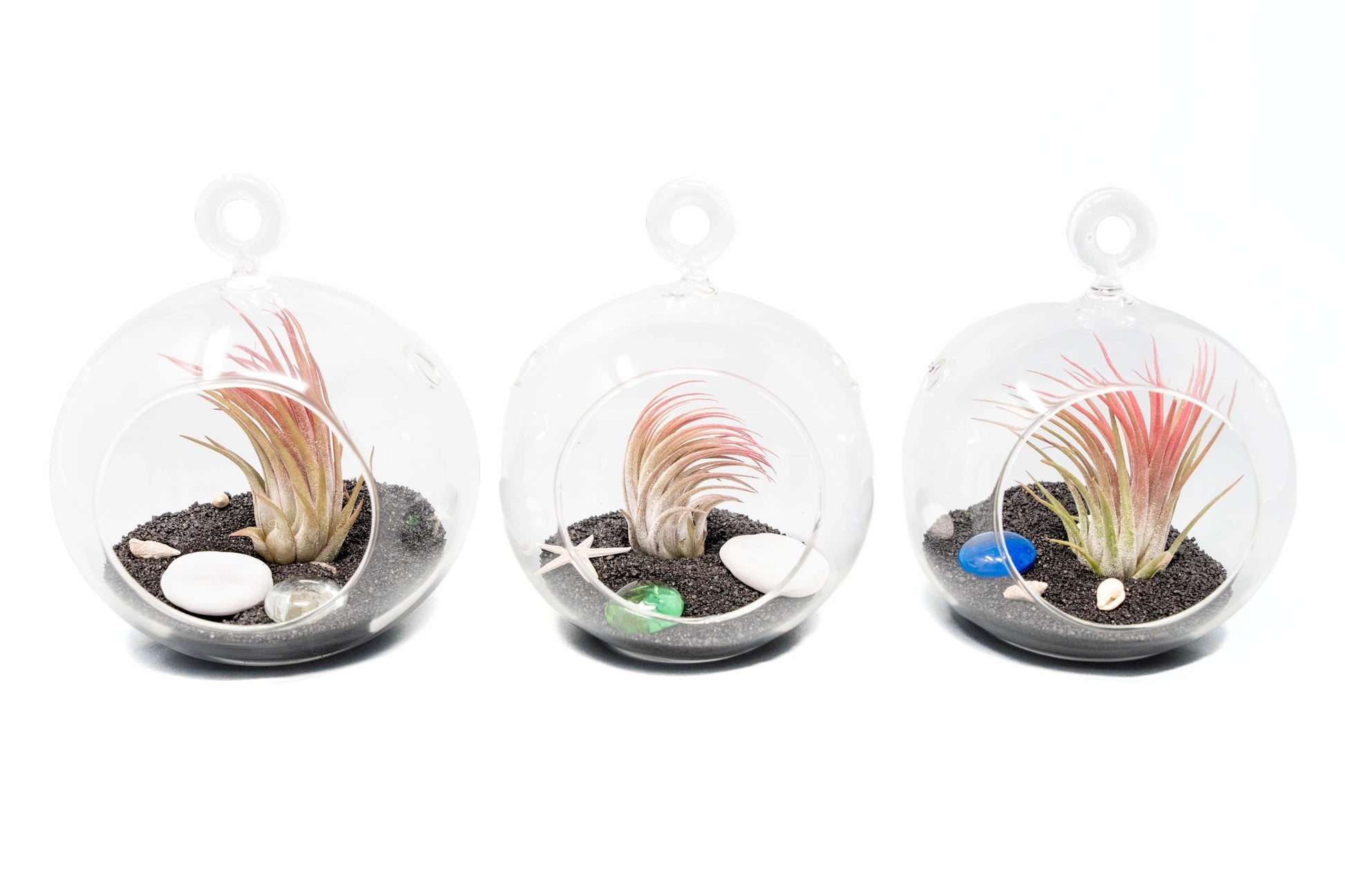 These cute beach terrariums in flat bottom glass globes are wonderful gifts, favors, or decorations. The kits include black sand, various sea life, glass bead, and ionantha. Just pour the sand in and place the starfish, seashell, and air plant inside. It is that easy!